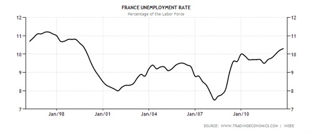 Nezaměstnanost ve Francii se letos vyhoupla nad 10 %. Bez práce je takřka čtvrtina mladých lidí ve věku do 25 let. Francouzská ekonomika stagnuje, podle analytiků je od léta v recesi.