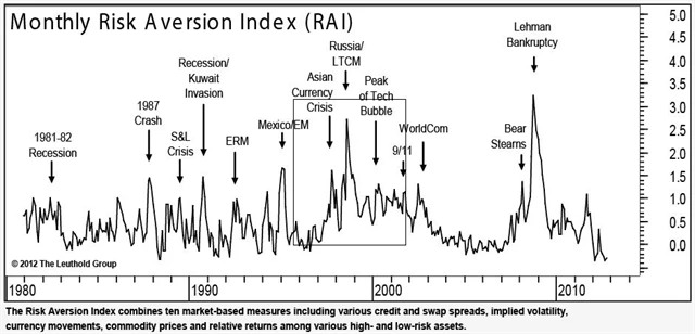 Podle indexu RAI, který na základě širokého spektra ukazatelů vyjadřuje obavy trhů z aktuálních rizik, nebyli investoři paradoxně nikdy optimističtější. Index, jenž mimo jiné reflektuje kreditní spready, kurzy měn, ceny komodit či výnosnost investic v porovnání s benchmarkem (srovnávacím indexem), dosáhl v prosinci 2012 nejnižších úrovní od roku 1980.