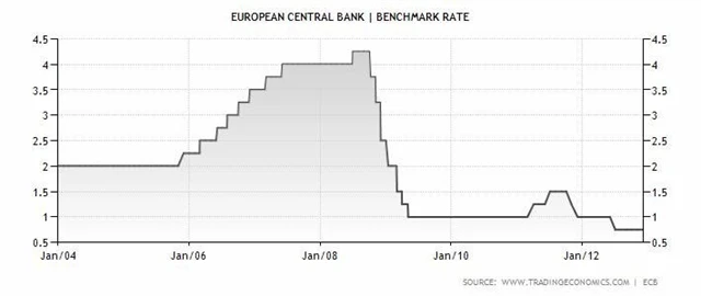 Základní úroková sazba je v eurozóně na minimu od července 2012. Od té doby ECB svými kroky, především silnými vyjádřeními Maria Draghiho o bezpodmínečné záchraně eura a přislíbením odkupu státních dluhopisů zemí, které se "svěří do péče" evropských záchranných fondů, velice pomohla náladě na evropských dluhopisových i akciových trzích, posílilo také euro.