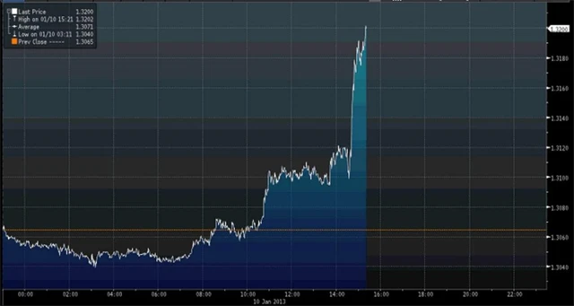 Evropská centrální banka na svém lednovém zasedání nechala základní úrokovou sazbu beze změny na 0,75 %. Podle průzkumu Reuters ale stále více ekonomů věří, že během prvního kvartálu 2013 sazbu sníží. Euro po oznámení posílilo nad 1,31 EUR/USD a během Draghiho tiskové konference dále posilovalo.