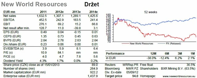 Na akcie NWR ponecháváme své doporučení "držet" s roční cílovou cenou 94 Kč na akcii vyčíslenou na základě modelu diskontovaného cash flow. Přibližně 11% pokles ceny akcií spuštěný slabými objemy za 4Q2012 a opatrným výhledem na nejbližší období poslal akcie na oprávněné úrovně.
