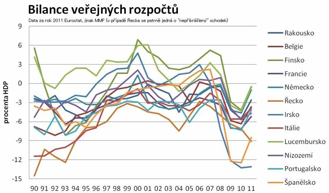 Jak ukazuje graf, po mohutném šetření počátkem 90. let minulého století, kdy k zavedení eura bylo zapotřebí snížit schodek státního rozpočtu pod 3 % HDP, se řada zemí opět propadla pod stanovenou mez. Jestliže v roce 1999 – při zavedení společné měny – splnilo 3% podmínku všech 11 zemí, o pouhých 5 let později dodržela limit jen polovina členů eurozóny.