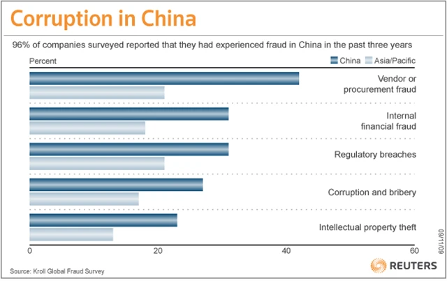 Čínská politika i ekonomika je korupcí prolezlá až do morku kostí. V průběhu posledních pěti let bylo v souvislosti s podezřením z korupce vyšetřováno 660 tisíc státních zaměstnanců. A nejde jen o řadové úředníky, některé případy se týkaly úplatků astronomické výše a sahaly do nejvyšších pater čínských ministerstev.