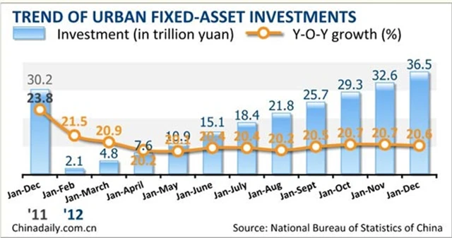 Růst fixních investic sice v roce 2012 dosáhl na první pohled úctyhodných 20,6 %, má to ale háček. Zatímco tímto číslem se Čína ráda chlubí, o jiném se příliš nezmiňuje – loni dosáhly investice do rozvoje čínské infrastruktury 3,63 bilionu liber (cca 5,75 bilionu USD a téměř 111 bilionů Kč). Ve snaze podpořit hospodářský růst tak zhoustla nejen dálniční a železniční síť, ale pod velkými čínskými městy se ve velkém začaly razit i nové tunely metra.