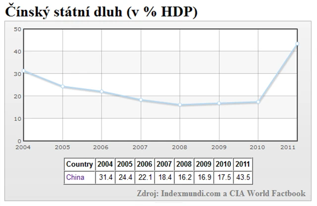 Masivní investice do infrastruktury samozřejmě nejsou zadarmo. Růst Číny je vykoupen časovanou bombou ve formě obrovského státního dluhu. Na dluh se ale nerozvíjí jen infrastruktura, například na snížení dopadů celosvětové finanční krize z roku 2008 dala čínská vláda 586 miliard USD. Vzhledem k čínské zálibě dávat světu jen ta čísla, která mluví v její prospěch, se navíc neví, jak velký ve skutečnosti čínský dluh je. Ačkoli graf pracuje s dluhem ve výši 43,5 % HDP, někteří ekonomové mluví až o 250 % HDP.