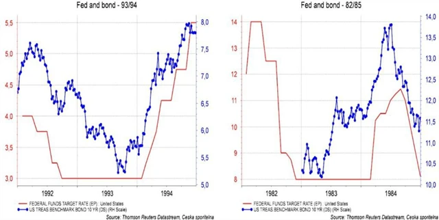Historická zkušenost ukazuje, že korekce zaprvé nenastává až v momentu, kdy zasáhne centrální banka, ale mnohem dříve. Zadruhé, je rychlá, a zatřetí, pohybuje se v řádech procentních bodů, což ilustruje následující graf.