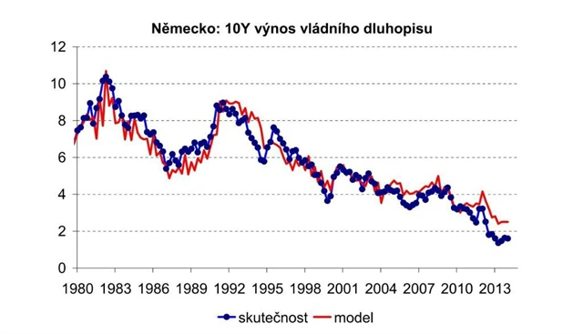 1. Makroekonomický model (HDP, inflace, objem dluhopisů) ukazuje, že jsou výnosy 10letých německých vládních dluhopisů podhodnocené - model implikuje výnosy na 2,5 %.