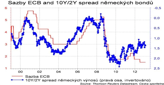 4. Zploštění výnosové křivky nelze vysvětlit sazbami ECB. Historická závislost ukazuje, že by spread mezi výnosy 10letých a 2letých dluhopisů měl být 70 bazických bodů.
