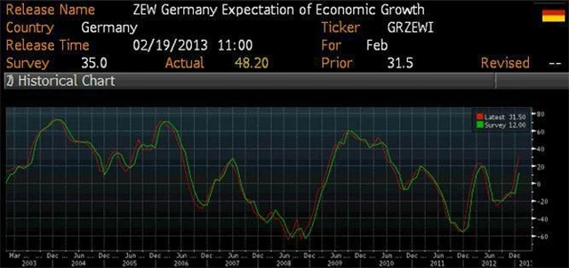 Bundesbank v pondělí oznámila, že očekává obnovení růstu německé ekonomiky již v tomto čtvrtletí, protože se důvěra zlepšuje a ve světové ekonomice začíná docházet k oživení. Ve čtvrtém čtvrtletí 2012 klesl německý HDP o 0,6 %, pokles byl hlubší, než trh očekával. Stálo za tím hlavně snížení vývozu a skutečnost, že firmy kvůli dluhové krizi eurozóny odkládají investice.