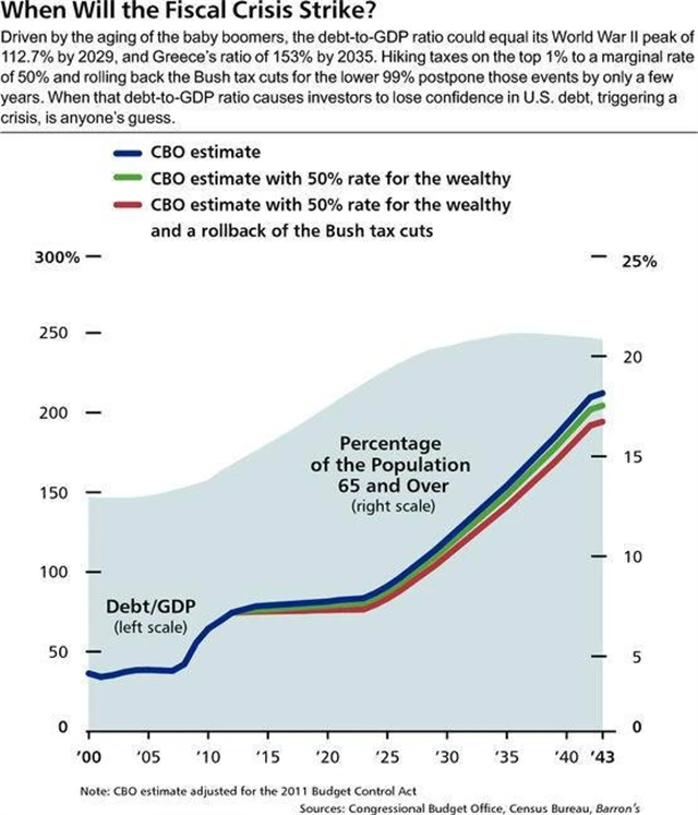 Podle odhadů Rozpočtové komise kongresu (CBO - Congressional Budget Office) upravené magazínem Barron's pro účely projekce, se dluh může snadno vyšplhat na 150 % HDP do roku 2035. S raketově vzrůstajícím dluhem mohou přijít i další problémy, zejména dlouhotrvající recese (ne-li deprese). K jejímu spuštění podle Barron's nevyhnutelně dojde v dalších dvou nebo třech dekádách. Americká míra nezaměstnanosti může mrknutím oka vystřelit k 20 %, stejně jako nyní v některých dluhovou krizí sužovaných evropských ekonomikách.