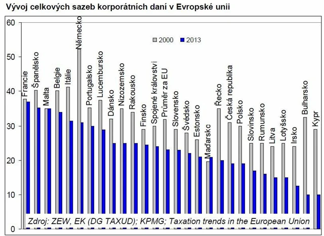"Největší snížení ve sledovaném období let 2000 až 2013 bylo o 25 procentních bodů v Německu u obecné sazby korporátní daně. Nutno však podotknout, že v Německu využívali a využívají solidární přirážky a různé lokální daně. Také v Bulharsku, na Kypru a v Řecku proběhl ve sledovaném období znatelný pokles o 15 procentních bodů. Ve Francii (33,33 %) a na Maltě (35 %) nedošlo v daném období u základních sazeb daně z příjmů firem (téměř) k žádným změnám."
