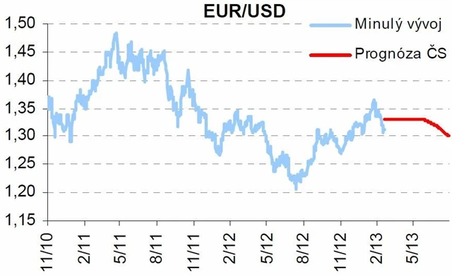 Kombinace reakce na poznámky ze zasedání FOMC, slabších dat z EMU (předběžný PMI za únor) a výsledků italských voleb poslala kurz EUR/USD až k psychologické hranici 1,30. Projev Bernankeho před Kongresem eliminoval dopad záznamu z FOMC, takže únor končí kurz mezi 1,31 a 1,32. Očekáváme, že v dohledné budoucnosti by měl kurz kolísat pod vlivem jednotlivých událostí mezi 1,30 a 1,35, riziko je momentálně především ve zvýšení tlaku proti euru, pokud by se komplikovala situace v Itálii.