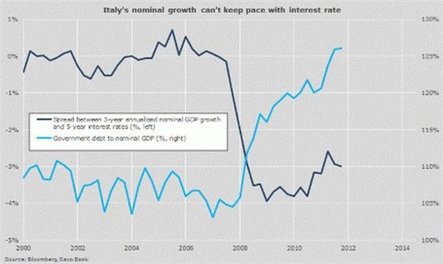 Ne všechno je ale v Itálii tak růžové. Největším problémem je to, že ekonomika neroste. Růst italského HDP je už od začátku roku 2008 nižší než pětiletá úroková sazba. A ještě zajímavější je to, že k nedostatečnému růstu ekonomiky došlo v období uvolněné měnové politiky a mohutně narůstajícího státního dluhu. Očekává se, že se letos stabilizuje ukazatel poměru dluhu k HDP. To však bude k ničemu, když se italská ekonomika znovu nenastartuje.