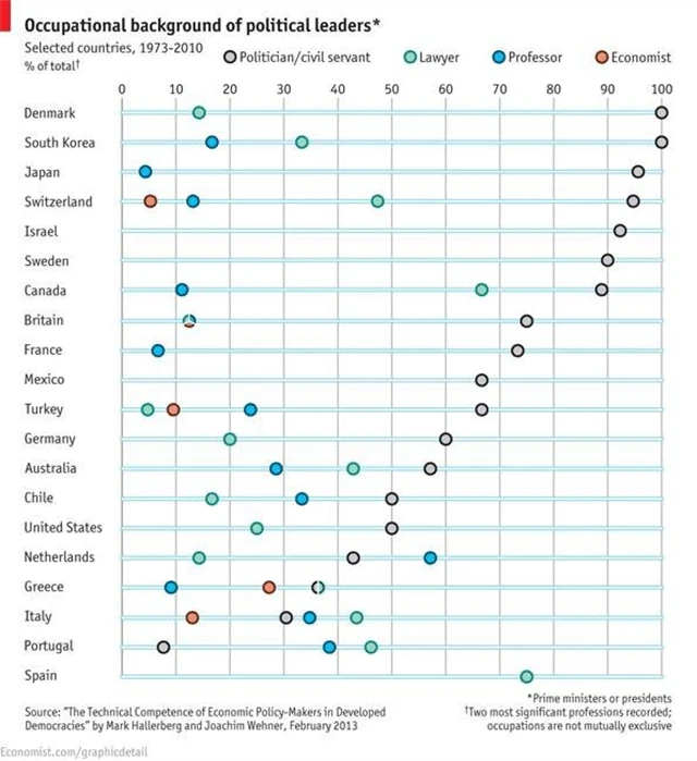 Mezi lety 1973 a 2010 byste mezi premiéry našli zhruba stejné zastoupení právníků, profesorů a politiků nebo státních úředníků. Na ekonomy jste mohli narazit jen ve třech případech z 23 - politici s "technickými kompetencemi" jsou častější během krize.