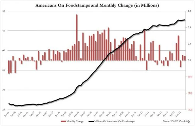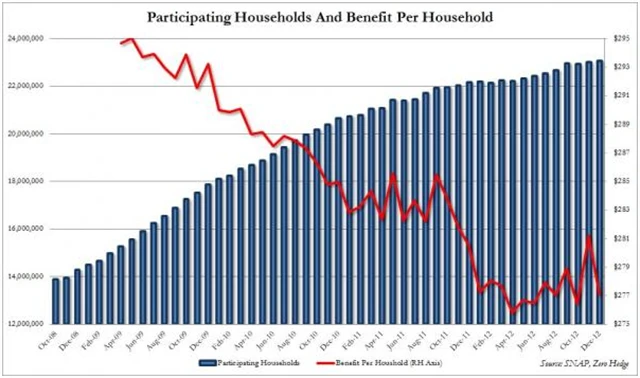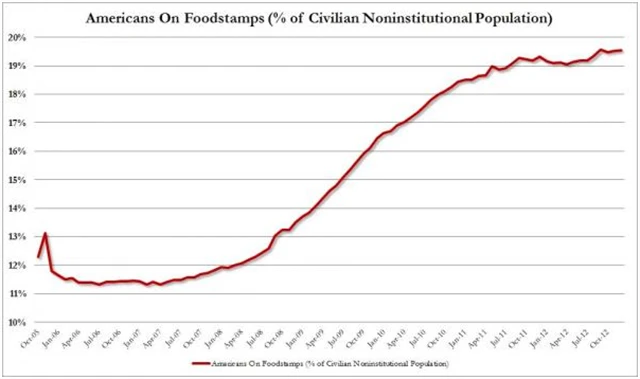 Podle údajů USDA rekordních 19,56 % Američanů schopných práce pobírá státní dávky pomocí EBT karty (Electronic Benefits Transfer card - obdoba naší sociální karty, kterou pro americkou vládu provozuje kdo jiný než JPMorgan - pozn. red.). V prosinci přibylo dalších 109 924 Američanů odkázaných na potravinové lístky. Celkově jich tak bylo 47,8 milionu.
