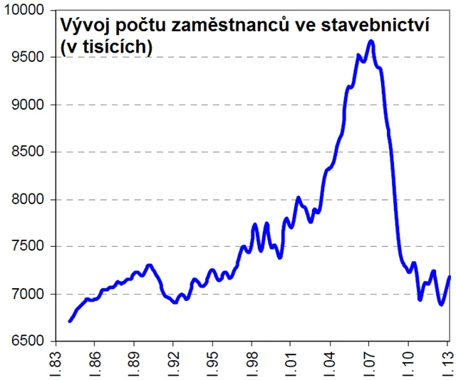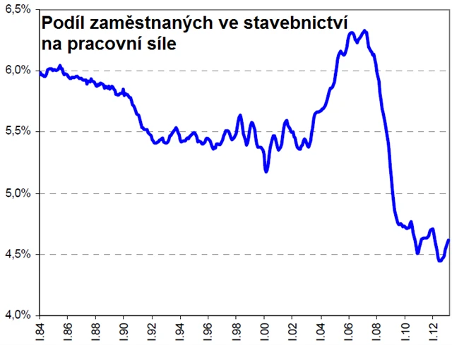 Ještě zřetelnější ilustrací postižení stavebnictví je vývoj podílu počtu zaměstnanců ve stavebnictví na pracovní síle. Na grafu je vidět jak nárůst počtu zaměstnanců v období boomu, tak následný prudký propad hluboko pod obvyklé úrovně. Je z něj rovněž patrné, že přes zřetelné příznaky oživení v sektoru rezidenčních nemovitostí se zaměstnanost v něm začíná vzpamatovávat jen velice pomalu.