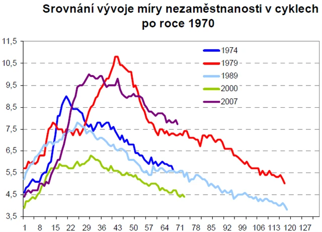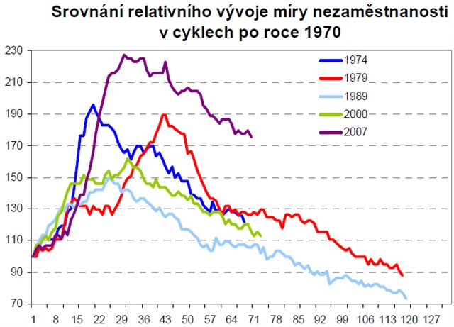Po odbočce ke strukturální slabosti trhu práce se vraťme k vývoji míry nezaměstnanosti. Při srovnání jejího vývoje v cyklech po roce 1970 Velká recese nevypadá na první pohled nijak nápadně, recese na začátku 80. let ji dokonce na první pohled zastiňuje. Problémem je však to, že růst nezaměstnanosti na začátku 80. let začal z vyšších úrovní, navíc tehdy šlo o dvě po sobě jdoucí recese.