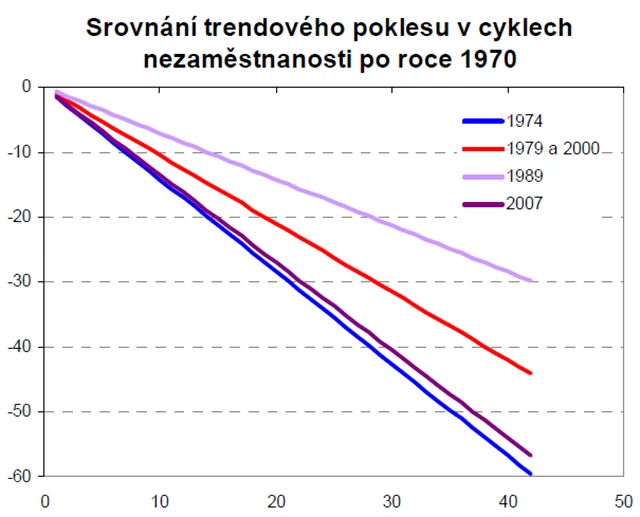 Pokles nezaměstnanosti měl v zobrazených recesích relativně stabilní tempo. Následují graf srovnává tempa jednotlivých poklesů (jde o lineární trendy z vrcholů míry nezaměstnanosti do konce cyklu).