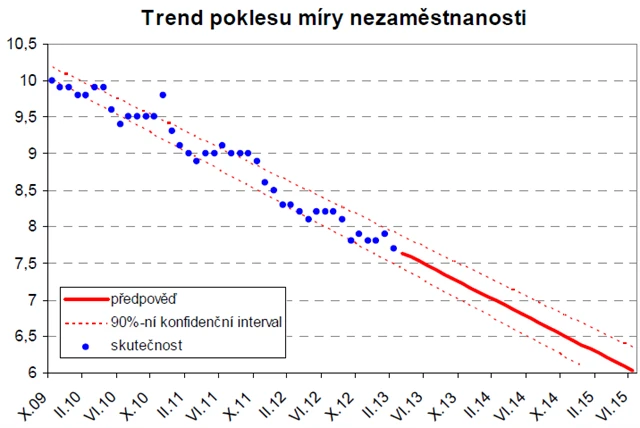 Trendu poklesu lze využít k odhadu, jak se bude míra nezaměstnanosti vyvíjet dále, čímž se vracíme k Fedu a jeho měnové politice. Fed si relativně nedávno stanovil kvantitativní kritéria pro zahájení zvyšování sazeb. Jedním z nich je udržitelný pokles míry nezaměstnanosti k 6,5 %.