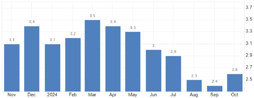 Meziroční tempo růstu spotřebitelských cen ve Spojených státech v říjnu stouplo o dvě desetiny procentního bodu na 2,6 %. Inflace tak zaznamenala první nárůst za sedm měsíců. V září byla inflace nejníže od února 2021. Meziměsíčně ceny v říjnu vzrostly o 0,2 %. Ekonomové nicméně podle agentury Reuters předpovídají, že inflace v USA se v příštím roce bude zvyšovat, pokud nový americký prezident Donald Trump v hospodářské politice přikročí ke svým plánům, které zahrnují například dodatečná dovozní cla. Trump rovněž slíbil masové deportace imigrantů bez dokladů, což podle ekonomů omezí nabídku pracovní síly a zvýší náklady podniků, které následně tyto dodatečné výdaje přenesou na zákazníky.