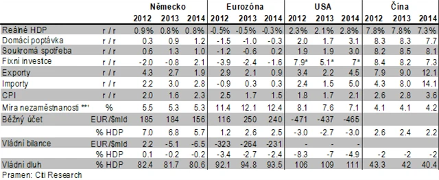 - Eurozóna s nezměněnou predikcí poklesu nejen v letošním, ale i v příštím roce, s poklesy hrubého domácího produktu v těchto letech o 0,5 % a 0,3 %. To odráží pokračující slabost na periferii eurozóny i pokračující konsolidaci veřejných financí.
