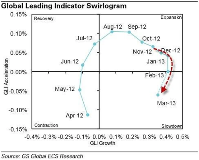 "Swirlogram" z dílny Goldman Sachs zachycuje globální průmyslový cyklus. Aktuálně je ekonomika ve fázi zpomalení. Dosavadní růst podle všeho ztrácí sílu. Zpomalení je taženo poklesem agregátní důvěry a nových objednávek (bez zásob). Není to jen situace USA, ale i Kanady a Austrálie.