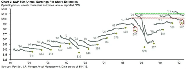 JPMorgan upozorňuje na nižší EPS (zisk na akcii) u S&P 500 ve srovnání s minulým vrcholem v letech 2007 a 2008. Většina růstu zisků bude muset plynut z tržeb, ne z navyšování marží. Tržby firem S&P 500 v historii rostly zpravidla ruku v ruce s nominálním světovým HDP. S indexy na rekordních maximech a zároveň neobvykle nízkými očekáváními EPS proto vyvstává otázka, jak někdo může americké akcie vůbec považovat za levné?