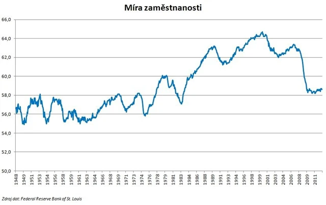 Právě dnes to mámě možnost vidět, většina podnikatelů totiž nechce nové peníze ani za nízký úrok, nemají pro ně upotřebení, a nemají tedy ani důvod najímat nové zaměstnance. Proto také vyspělé ekonomiky trápí nízká míra zaměstnanosti. Učebnicovým příkladem jsou Spojené státy. Graf ukazuje vývoj míry zaměstnanosti, tedy poměru zaměstnaných lidí a podnikatelů k celkové populaci v produktivním věku, v USA od roku 1948. Dnes je na stejné úrovni jako v polovině 70. let.
