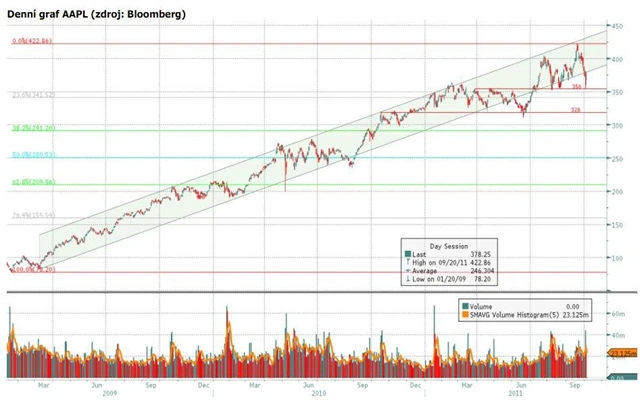 Akcie společnosti Apple jsou nyní krátkodobě pod tlakem. Rozhodně nejsem zastáncem pokračování růstového trendu o dalších několik stovek dolarů, nicméně aktuální pokles představuje příležitost pro nákup na hranici růstového trendu, kdy by mohlo dojít ještě k jedné růstové vlně na horní hranici trendového kanálu.
