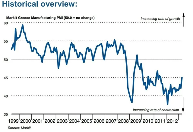 Tempo poklesu v oblasti nových zakázek a produkce se v dubnu zpomalilo a Řecko tak dosáhlo na téměř dvouleté maximum. Produkce se zhoršila nejméně od června 2011 a ceny vstupů klesly poprvé za poslední čtyři roky. Hodnota indexu v dubnu vyskočila na 45 bodů z březnových 42,1 bodu.