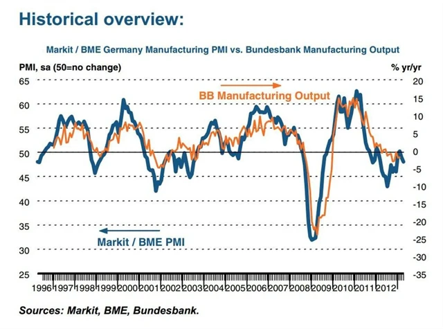 Zpracovatelský sektor v Německu v dubnu spadl z březnových 49 bodů na 48,1 bodu, což ukazuje mírné zhoršení podmínek v sektoru. Pokles o 0,9 bodu je však nejrychlejší od prosince loňského roku. Produkce klesla poprvé v letošním roce následována propadem zaměstnanosti a nových zakázek.