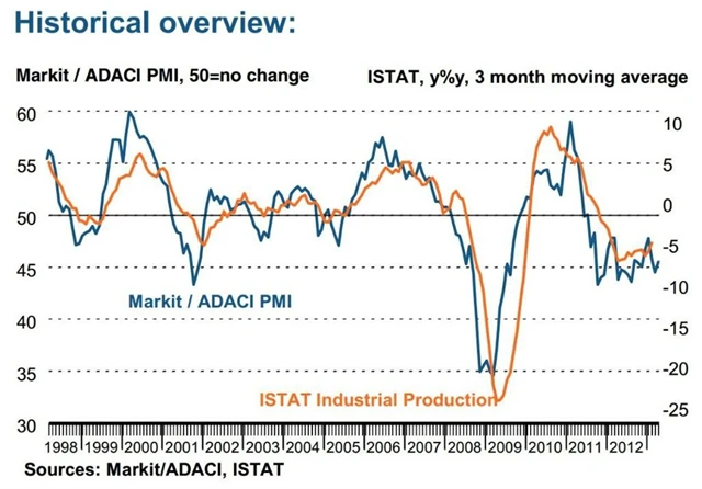 Ve zpracovatelském sektoru v Itálii v dubnu dále propadá zaměstnanost a produkce odvětví. Index nákupních manažerů sice vykázal zlepšení o jeden bod z březnových 44,5 na 45,5 bodu, stále je však 4,5 bodu pod padesátibodovou hranicí, což naznačuje špatné podmínky v sektoru. Zaměstnanost a produkce odvětví v dubnu dále klesala, ale pomalejším tempem než v březnu. Stejně jako v České republice i v Itálii významně klesly ceny vstupů, takže přestože dále klesají nové zakázky (což souvisí se sníženou poptávkou po produkci), firmám přinejmenším nerostou náklady.