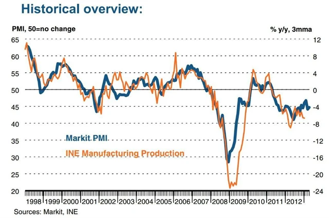 PMI ve zpracovatelském sektoru ve Španělsku v dubnu stále zůstává hluboko pod hranicí 50 bodů. Mírně se oproti březnovým 44,2 bodu vylepšil na 44,7 bodu, již druhým rokem však vykazuje pesimismus manažerů a těžké zaostávání sektoru. Index drží dole především pokračující pokles v oblasti nových zakázek a příchodu nových firem do sektoru, kvůli snížené poptávce po produkci.