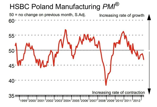 HSBC Markit index nákupních manažerů ve zpracovatelském sektoru v Polsku v dubnu spadl na téměř čtyřleté minimum. Dále se nachází hluboko pod hranicí padesáti bodů na 46,9 bodu, nejníže od července 2009. Objem nových objednávek v dubnu dále klesal a pokračuje tak v sestupném trendu od únory 2012, nejrychlejším tempem od loňského září.