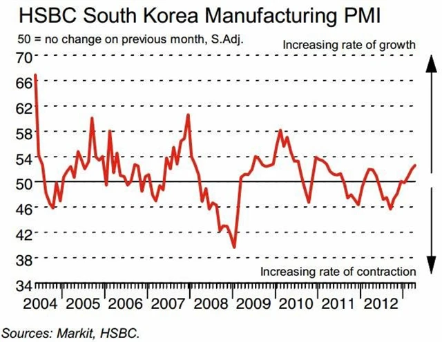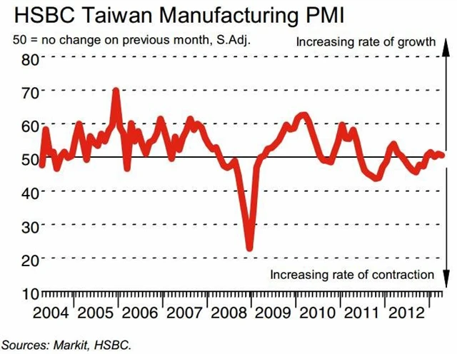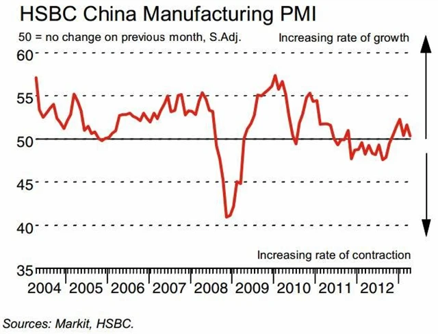 Paralelně konstruovaný index PMI společností HSBC a Markit se pošesté v řadě udržel nad 50 body, ačkoli oproti březnu poklesl. Zaznamenal 50,4 bodu po březnových 51,6 bodu.