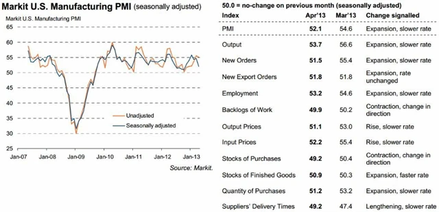 Index ISM klesl na 50,7 bodu z březnové úrovně 51,3 bodu a zhoršil se výrazněji, než čekali analytici. Hodnota indexu se těsně přiblížila hranici 50 bodů, která odděluje růst aktivity od jejího poklesu. Ukazatel zaměstnanosti se propadl o plné čtyři body na 50,2 bodu. O téměř bod na 52,3 bodu naopak vzrostl index nových zakázek, který předznamenává budoucí vývoj.