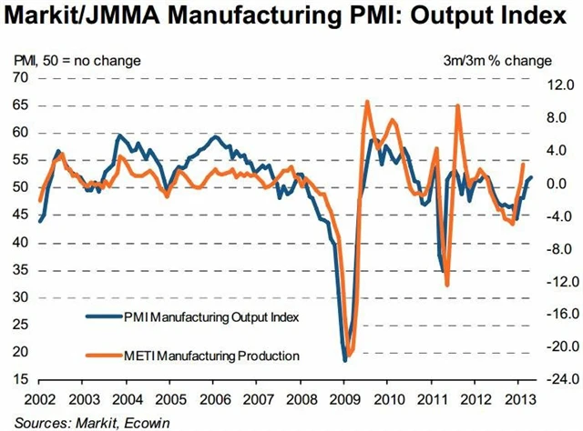 Nálada v Japonsku se zlepšuje díky oslabujícímu jenu. V dubnu PMI ve zpracovatelském sektoru vzrostl na 51,1 bodu z březnových 50,4 bodu. Jde o nejlepší výsledek za 13 měsíců.