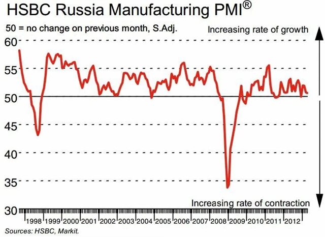 Nálada ve zpracovatelském sektoru se v dubnu v Rusku zlepšila jen minimálně, i tak se ale drží nad 50 body indexu PMI. Konkrétně index dosáhl 50,6 bodu, po březnových 50,8 bodu a je nejníže za 4 měsíce.