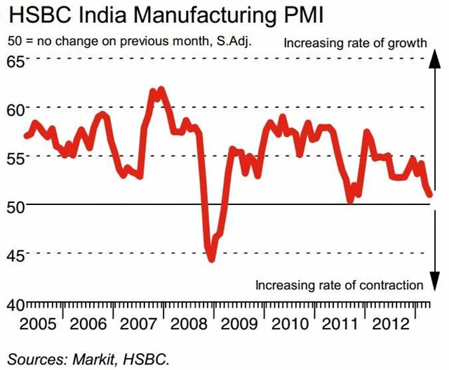 Podmínky v indickém průmyslu se v dubnu opět zlepšily. PMI ovšem klesl na 51 bodů, což je nejméně od listopadu 2011, když se zhoršil výsledek ve všech pěti subindexech. Index se ale drží nad 50 body již 49 měsíců v řadě.