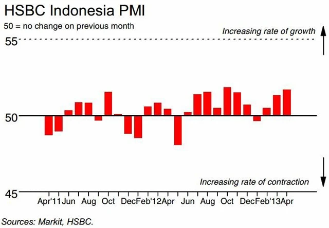 Třetí měsíční zlepšení v řadě hlásí Indonésie. 51,7 bodu v dubnu je lepších než březnových 51,3 bodu. Čtyři z pěti stavebních kamenů indexu vykázaly zlepšení a index dostaly na půlroční maximum.