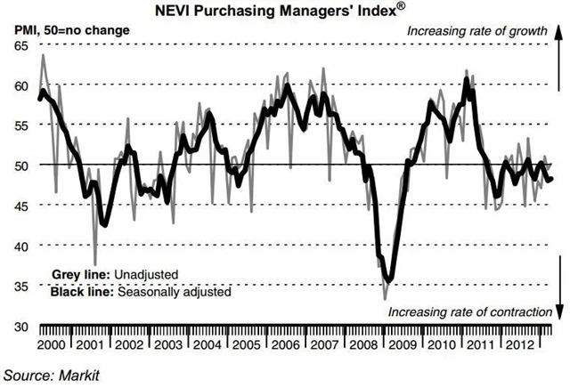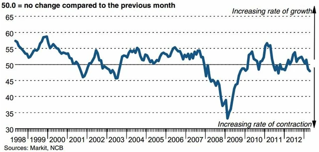 Produkce klesla podruhé za sebou, dále se propadají i nové objednávky. PMI celkově sice mírně vzrostl na 48,2 bodu z březnových 48 bodů, ale stále je výrazně pod 50bodovou hranicí, která odděluje očekávání poklesu a očekávání růstu.