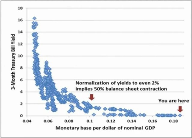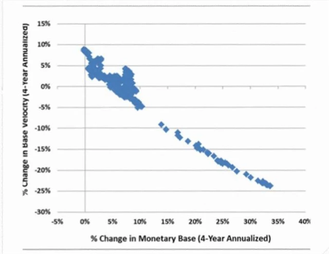 Když zvyšujeme monetární bázi, rychlost oběhu peněz klesá, což je důvod, proč kvantitativní uvolňování nefunguje.