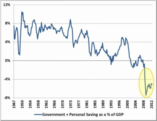 Když vládní deficity rostou, úspory domácností klesají. Deficit jednoho sektoru se musí projevit jako přebytek v sektoru jiném.