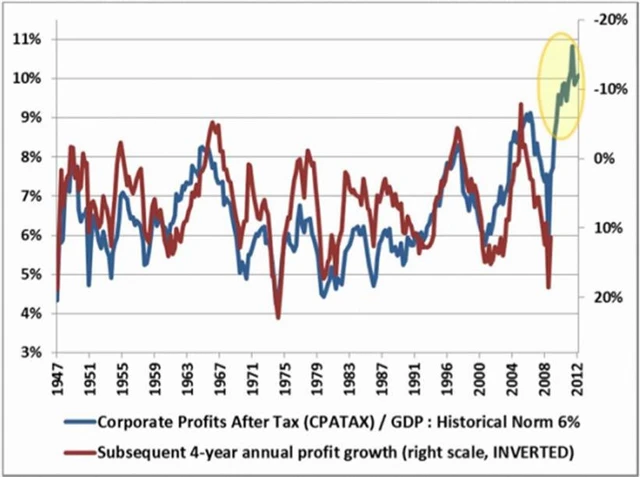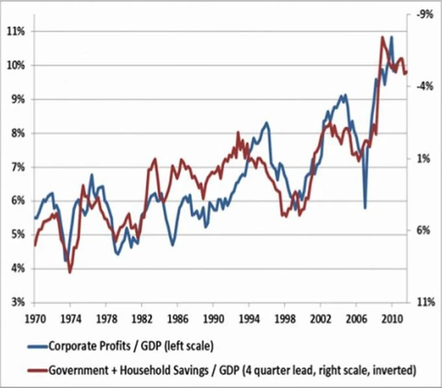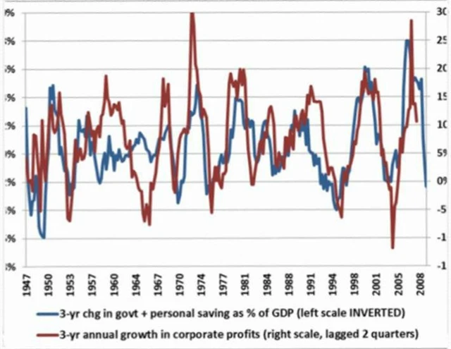 Rekordně negativní hodnoty součtu úspor vlády a domácností vedou k růstu firemní ziskovosti k rekordním maximům. Ziskové marže firem jsou v současnosti 70 % nad historickým normálem. Firmy benefitují z vládních výdajů, které vedou k rozpočtovým deficitům, navzdory tomu, že se mzdy drží na rekordních minimech ve vztahu k ekonomice.