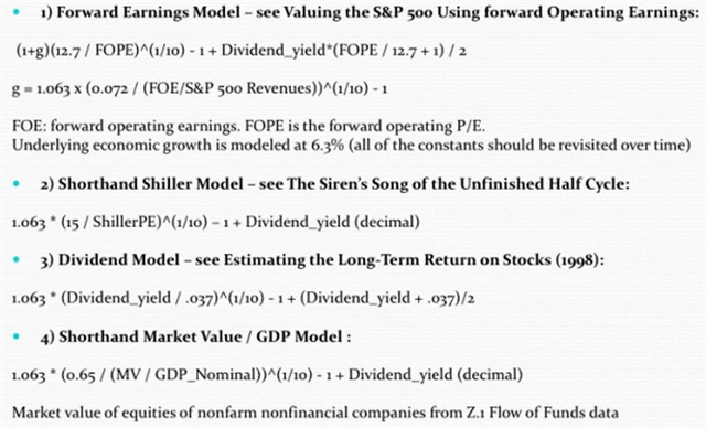 Následující grafika popisuje, jak se Hussman dostal ke svému odhadu nízkých očekávaných výnosů. Předpokládá návrat k průměru.