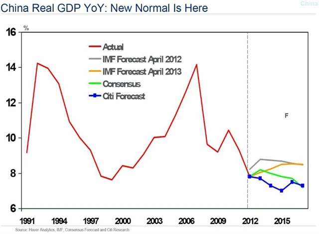 Růst v 1. čtvrtletí zklamal především vlivem slabší spotřeby, tento stav může trvat ještě ve zbytku roku. Finanční podmínky zůstávají uvolněné, zpřísnění monetární politiky bude pravděpodobně odloženo díky příznivému vývoji inflace. Citi snížila svůj výhled letošního růstu ze 7,8 % na 7,7 %. Meziroční růst by se měl nepatrně zrychlit ve druhém a třetím čtvrtletí, ale s tendencí poklesu ve čtvrtém kvartálu.