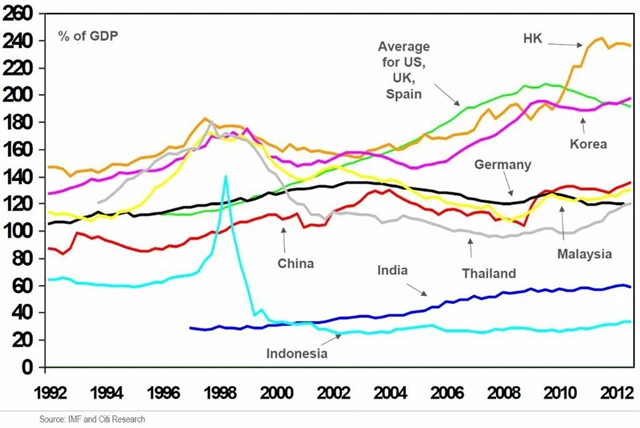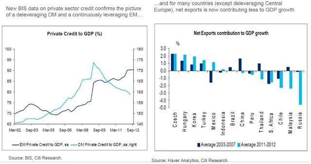 Nová data Banky pro mezinárodní platby (Bank for International Settlements - BIS) o úvěrové aktivitě soukromého sektoru potvrzují, že vyspělé trhy stále procházejí procesem oddlužování (deleveragingu), zatímco mladé trhy se naopak zadlužovat teprve začínají. Mnohým zemím (kromě centrální Evropy, která také prochází deleveragingem) přispívá nyní čistý export k růstu HDP méně.