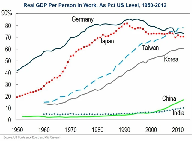 Vyššího růstu čínského HDP by mělo být dosaženo prostřednictvím lepšího využití práce a vyšší produktivity (konkurenční oceňování):