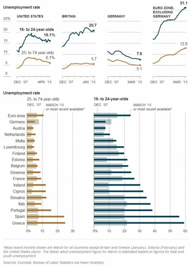 Nezaměstnanost v Německu je nižší, než byla na začátku finanční krize. To bohužel nelze říct ani o Spojených státech, ani o většině zemí Evropské unie. Německá míra nezaměstnanosti u dospělých sice není o mnoho níže než například v USA nebo ve Spojeném království, jiná je ale situace mezi mladými lidmi. Německo tedy vládne nejen fotbalové Evropě, ale také statistikám trhu práce ve vyspělých zemích, které se jen pomalu vzpamatovávají z krize.