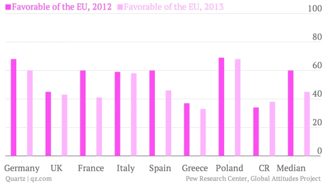 Jak poodhalila studie Pew Research Center nazvaná Global Attitudes Project, jen za rok 2012 klesla celková podpora Evropské unie z 60 na 45 %.